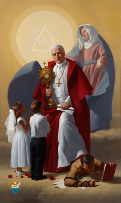 Tableau : « Le pape St. Pie X » par Neilson Carlin, 2011 [Cathédrale de l’Immaculée Conception, Kansas City, MO]. Les mots en latin en bas du tableau, INSTAURARE OMNIA IN CHRISTO, signifient : « Tout restaurer dans le Christ » et les caractères hébreux signifient « Yahvé ».