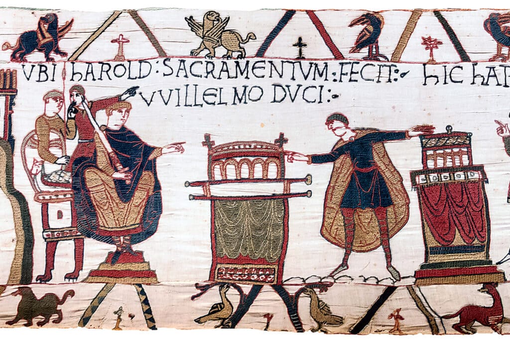 L’histoire contée par cette broderie commence deux ans auparavant, à la fin du règne d’Édouard le Confesseur, roi d’Angleterre. Sans descendance, Édouard envoie son beau-frère, le comte Harold, annoncer à Guillaume, son petit-cousin, qu’il lui léguera son trône après sa mort. Harold prête serment à Guillaume – sur des reliques – mais il se parjure et se fait couronner roi à la mort d’Édouard. Ce parjure entraîne une crise de succession. Il justifie, pour Guillaume, la conquête de l’île. Et l’excommunication d’Harold par le Pape.