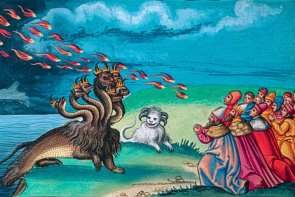 Pour essayer d’y voir clair, reprenons les choses d’un peu plus haut. L’Apocalypse est une « vision » donnée à saint Jean par l’Esprit Saint. Vision, sous forme métaphorique, du conflit entre le bien et le mal, jusqu’au retour victorieux de Jésus-Christ. Aux chapitres 12 et 13, saint Jean décrit trois créatures maléfiques : le « Dragon », la « Bête de la mer » et la « Bête de la terre ».