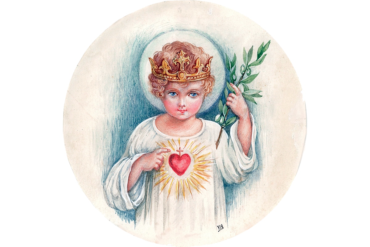 Outre la vénération des statues, la dévotion à l’Enfant-Jésus s’est également répandue chez les grands spirituels et à travers eux. En Normandie, à la fin du XIXe siècle, sainte Thérèse de Lisieux raconte ce qu’elle pensait, à 9 ans, désirant déjà entrer au couvent : «Je me demandai quel nom j’aurais au Carmel (…). Je pensai au Petit Jésus que j’aimais tant et je me disais : “Oh ! que je serais heureuse de m’appeler Thérèse de l’Enfant-Jésus !” » Elle développera par la suite sa célèbre « petite voie » de la spiritualité de l’enfance : abandon, confiance, petitesse… Au XXe siècle, Mère Yvonne-Aimée, future supérieure des augustines de la Miséricorde de Malestroit, reçoit, au début de sa vie mystique, en 1922, une vision de Jésus lui demandant de dire et faire dire cette invocation : « Jésus, Roi d’amour, j’ai confiance en ta miséricordieuse bonté. » Plus tard, pendant la Deuxième Guerre mondiale, elle dessine Jésus sous les traits d’un enfant, pour aider à la diffusion de cette prière : « Nous avons voulu représenter Jésus Enfant et Roi pour attirer plus facilement les âmes et leur donner espoir, expliquera-t-elle. Nous avons voulu rappeler que c’est par son divin Cœur, plein de miséricorde et d’amour pour l’humanité, que nous obtiendrons la paix du monde. » Sœur Odile, archiviste de la communauté, précise que c’est « d’après la mémoire des visions qu’elle a reçues de l’Enfant-Jésus qu’elle a peint ce tableau ». Aujourd’hui encore, les augustines diffusent la pieuse image aux malades de leur clinique et des soins palliatifs, où elle continue de faire grand bien.