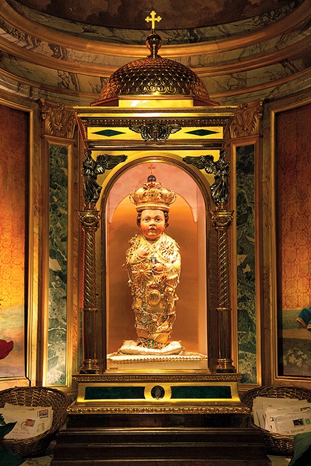 Témoin de la soif spirituelle, l’afflux dans les sanctuaires de l’Enfant-Jésus croît dans le monde entier : Italie, Espagne, Salvador, Mexique, Philippines, Inde, Bolivie, Chili, Slovaquie… La liste fait le tour de la Terre, comme les bras de cet Enfant qui enserrent le monde de son amour… Sous les traits de cet Enfant, Jésus semble vouloir faire résonner de nouveau l’avertissement lancé à ses disciples de l’urgence de se convertir pour devenir « comme les petits enfants », sous peine de ne pas entrer « dans le royaume des Cieux » (Mt 18,3). Par la médiation de statues, d’images, de neuvaines, de prières diverses, et de tant de pieuses pratiques de dévotion à sa Sainte Enfance, il veut faire la conquête des cœurs, offrant ses innombrables grâces. Et veut sans doute, aujourd’hui, être utilisé comme instrument d’une réévangélisation, à travers le mystère insondable de son abaissement absolu dans une étable. Marie, Joseph, les bergers, les mages et les anges, sont les premiers à être tombés à genoux devant cet Enfant Roi. Et nous attendent.