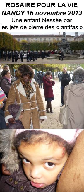 Le samedi 16 novembre, une petite fille participe à un rosaire public dit à l’intention des tout petits. C’était à Nancy : des gens de l’ultra-gauche se croient intelligents en manifestant bruyamment leur opposition : tant qu’il ne s’agit que de bruits, fussent-ils excessifs, désagréables, ridicules, quelle importance ? Mais les voilà qui se mettent à lancer des pierres contre ce rassemblement on ne peut plus paisible. Des pierres ? Vieux réflexe de l’ancienne lapidation qui réapparaît ?